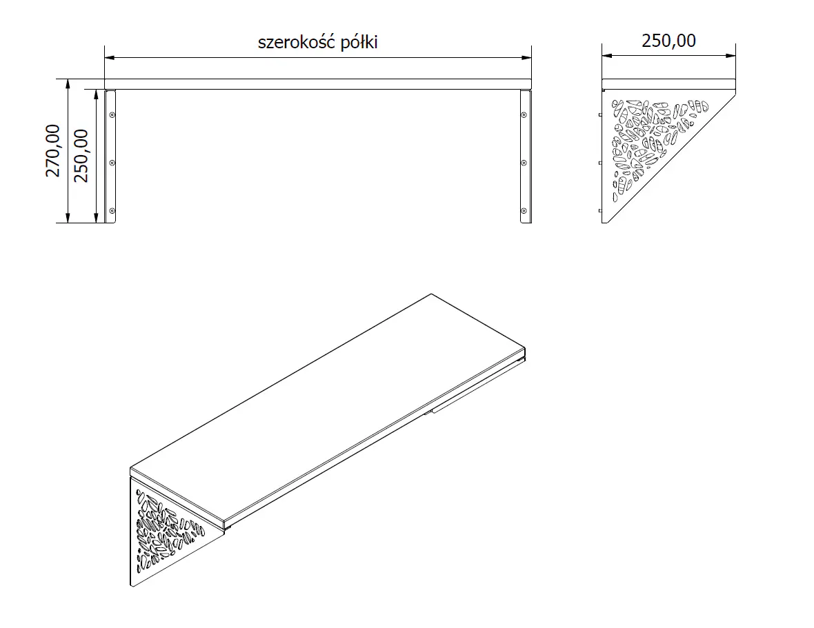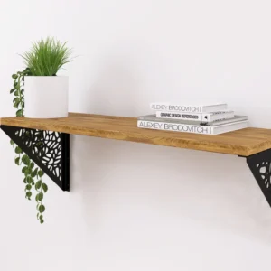 Podkreśl naturalny charakter swojego wnętrza dzięki dębowej półce ściennej z ozdobnym stalowym wspornikiem zdobionym delikatnymi wycięciami w kształcie listków. Ta wyjątkowa półka łączy ciepło drewna z subtelną elegancją roślinnych detali, tworząc idealne uzupełnienie każdej aranżacji.