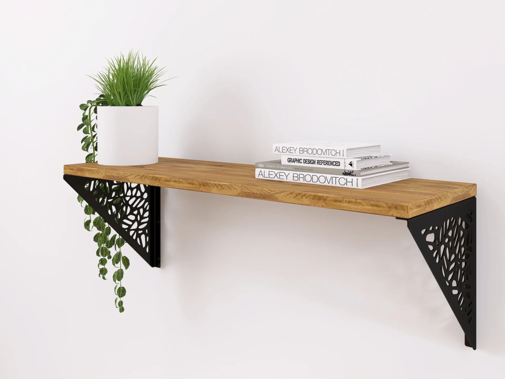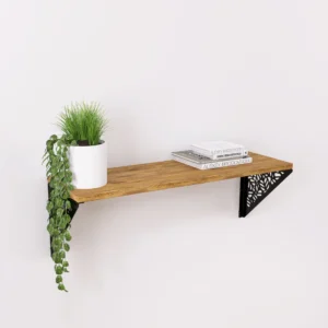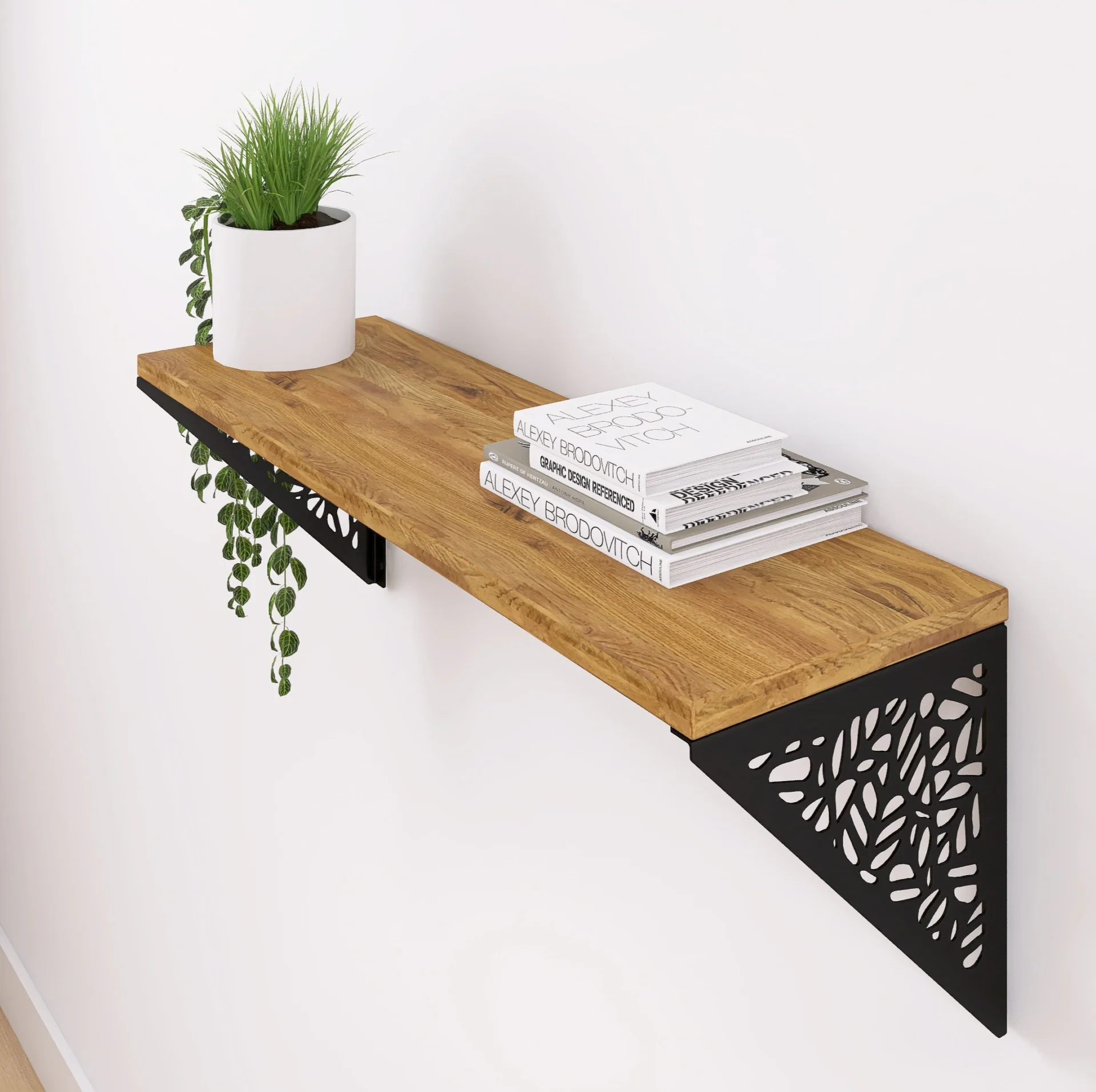 Półka ścienna dębowa z czarnym stalowym wspornikiem o wycięciach w kształcie listków