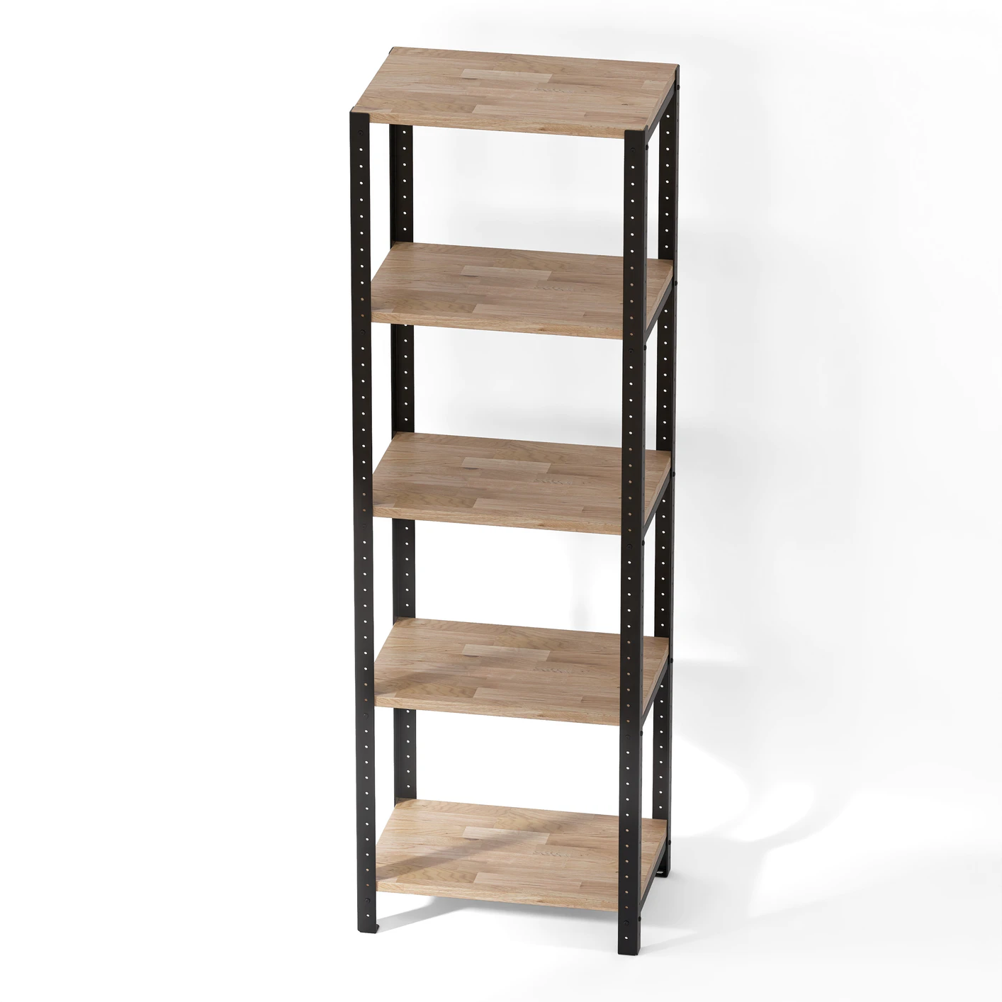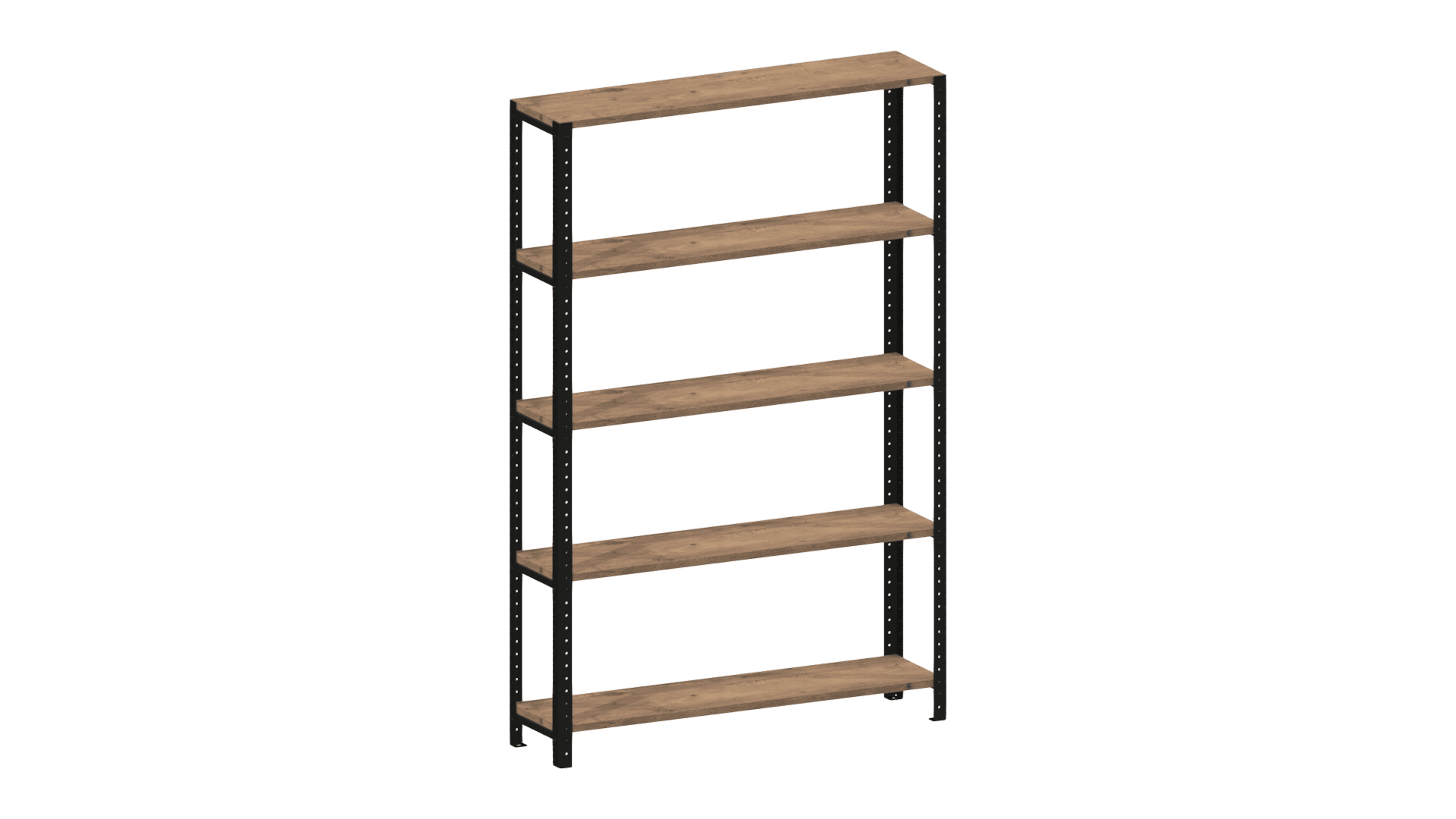 Regał składa się ze stalowej konstrukcji oraz laminowanych półek imitujących drewno. Komponenty są wysokiej jakości i pochodzą od polskich producentów. Są też odpowiednio zabezpieczone – stal jest pokryta farbą chroniącą przed rdzą i uszkodzeniami, a półki wykonane zostały z prasowanych płyt wiórowych powleczonych termoutwardzalną żywicą. Dzięki temu regał jest wytrzymały, a jego elementy nie wymagają regularnej konserwacji.