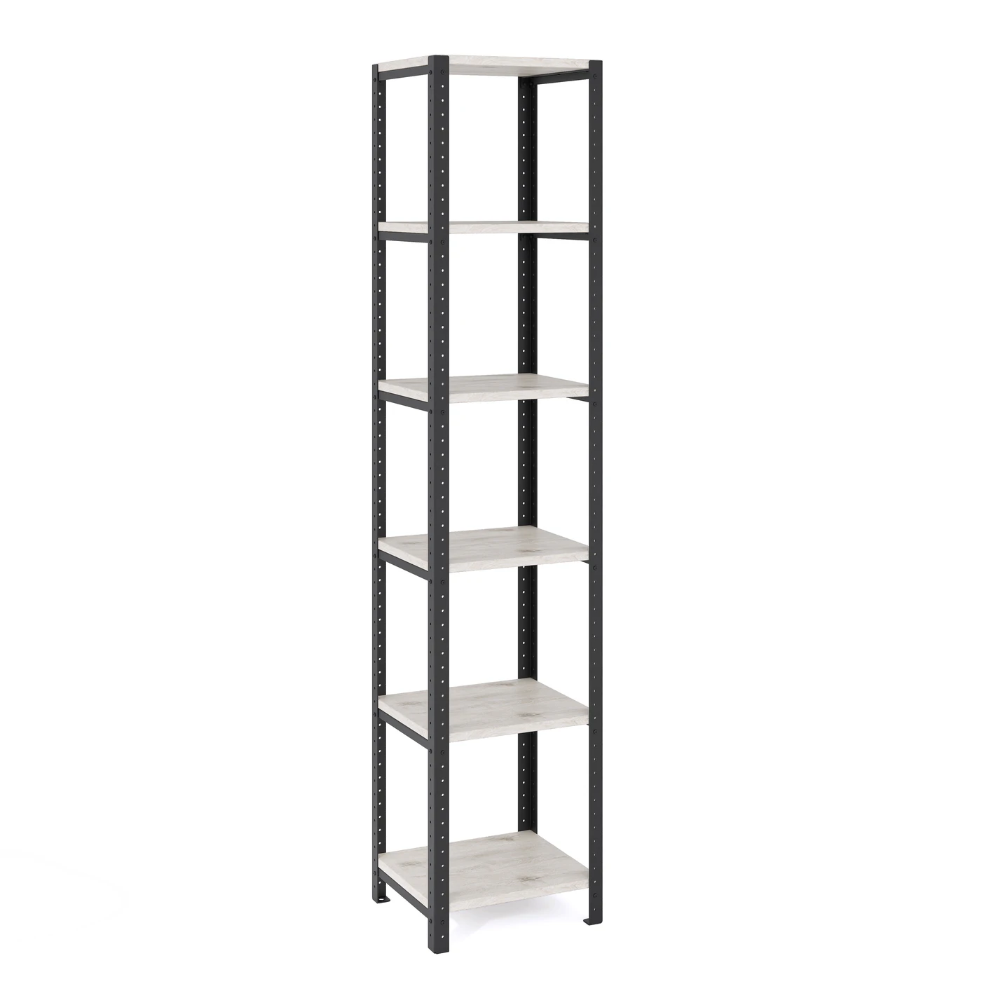 Niski i wąski regał loft 50x35x82 cm posiada laminowane półki i stalową konstrukcję. Półki wykonane są z prasowanych pod ciśnieniem płyt wiórowych pokrytych laminatem z termoutwardzalnej żywicy. Są odporne na ścieranie i uszkodzenia oraz nie wymagają regularnej konserwacji. Stalową konstrukcję malujemy proszkowo czarną antykorozyjną i nieodpryskującą farbą, aby regał służył Ci przez długi czas.