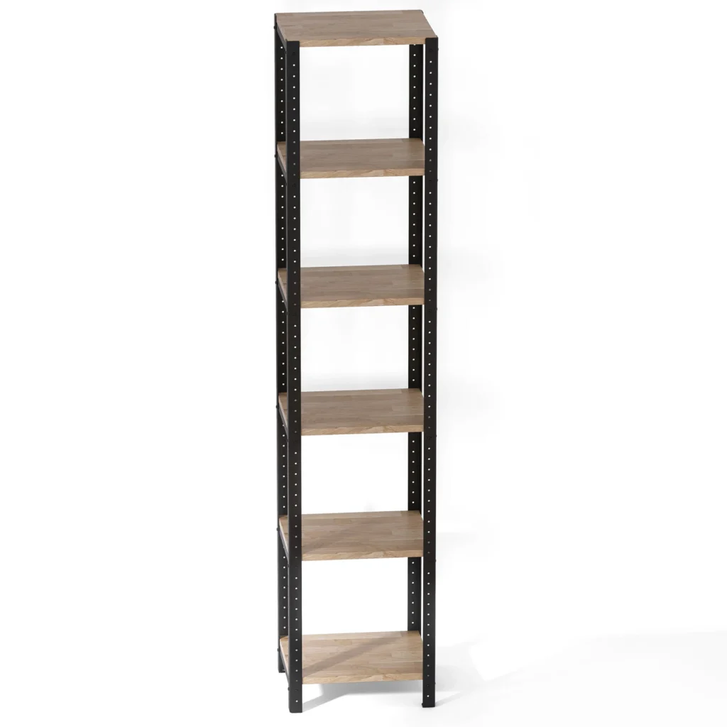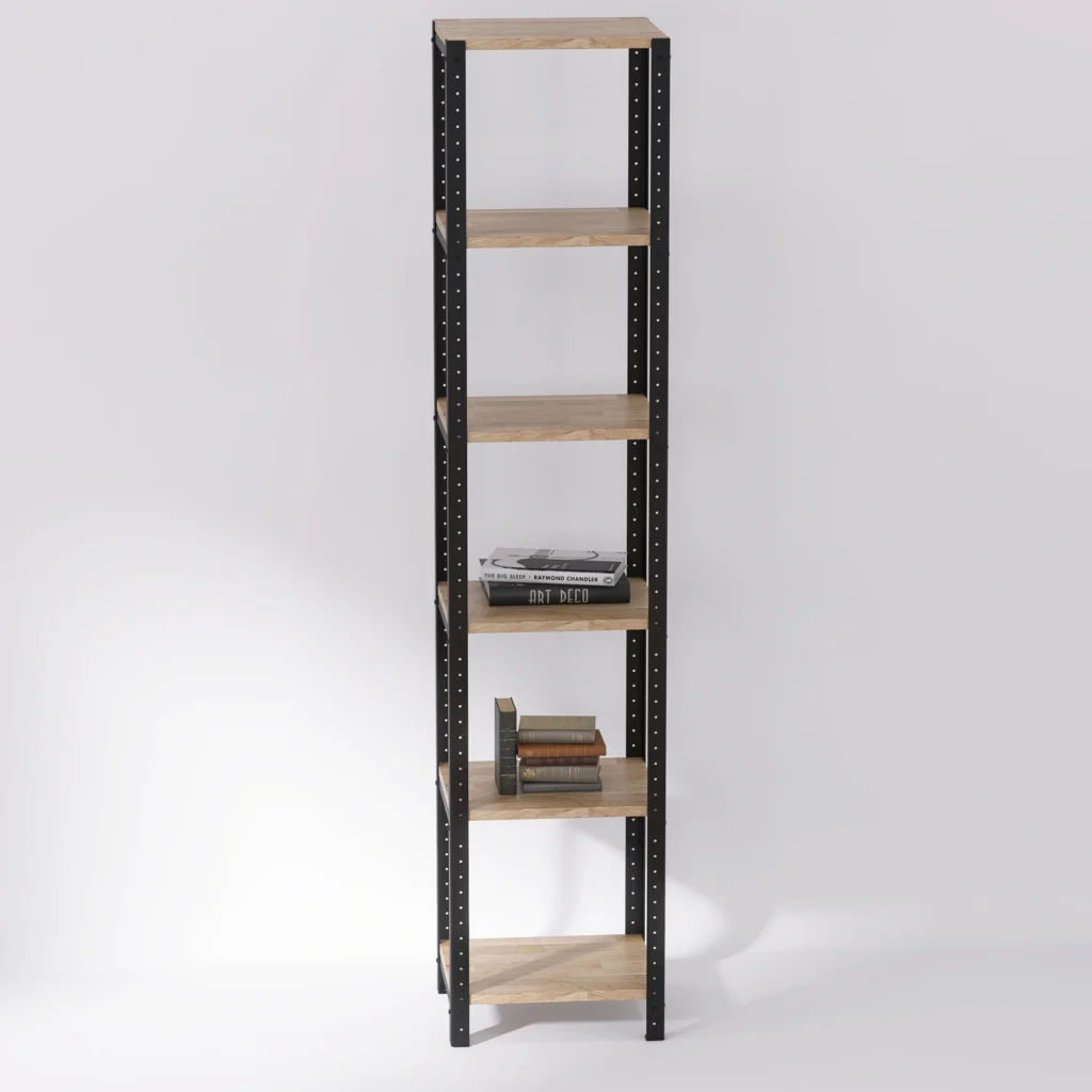 Wąski regał loft 40x35x190 cm z dębowymi półkami to też wysoki mebel, który ze względu na swoje rozmiary idealnie nadaje się do zabudowy wnęk lub zagospodarowania przestrzeni o małej powierzchni. Po połączeniu z innymi meblami modułowymi stworzy oryginalną meblościankę do salonu czy biura.