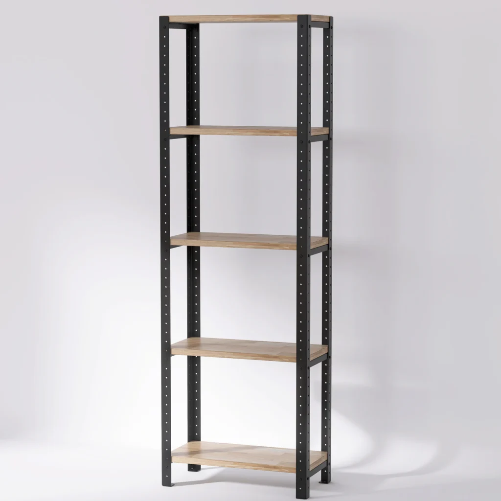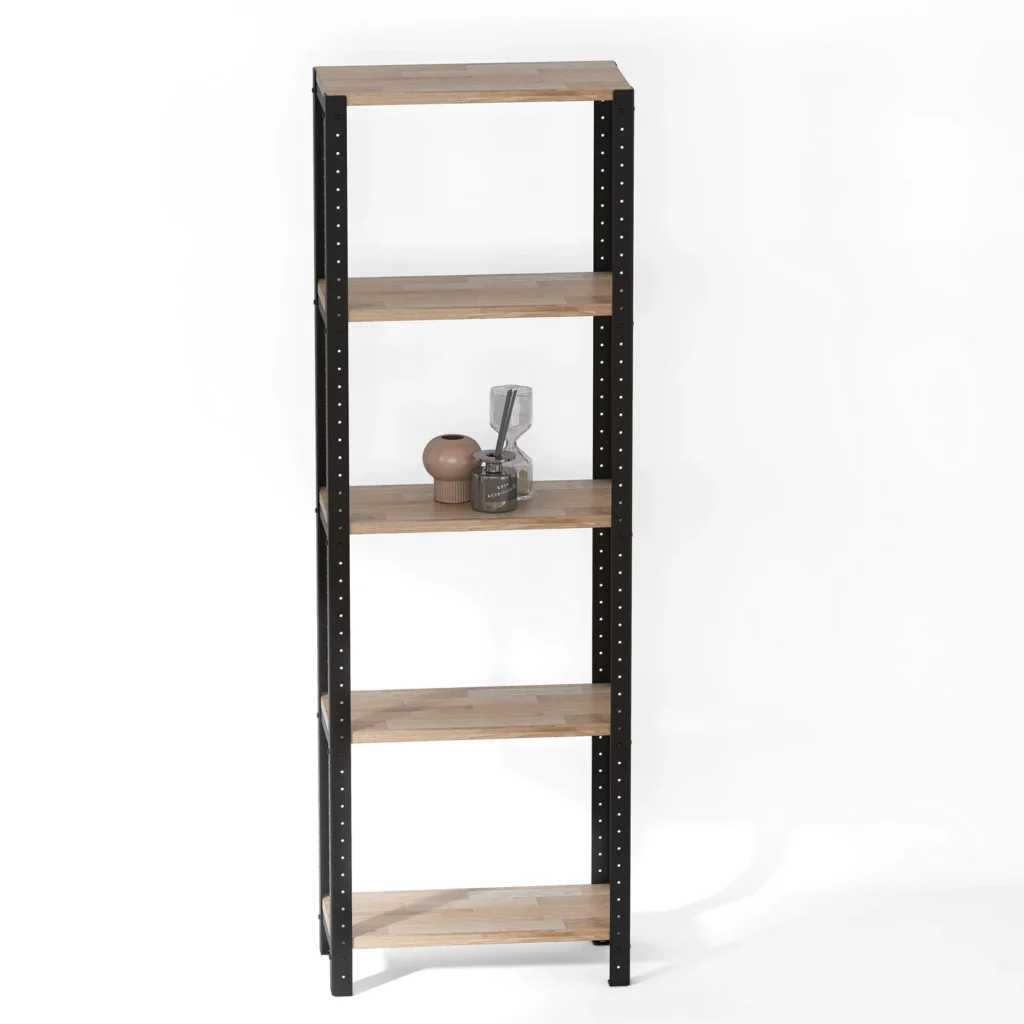 Wąski regał loft 50x25x154 cm z dębowymi półkami z łatwością dopasujesz do dowolnej przestrzeni dzięki uniwersalnym wymiarom, minimalistycznej budowie oraz naturalnym komponentom. Dodatkowo aranżację przestrzeni ułatwia modułowa konstrukcja pozwalająca na samodzielne łączenie mebli.