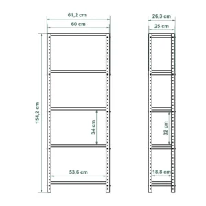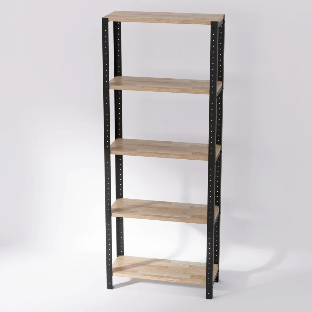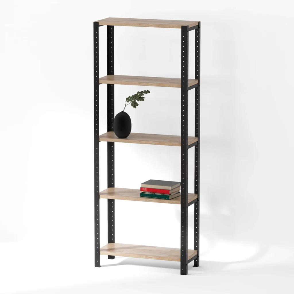 Regał loft 60x25x154 cm z dębowymi półkami do dość wysoki mebel, który dzięki uniwersalnym wymiarom i systemowej konstrukcji może pełnić wiele różnych funkcji. Klasyczna budowa ułatwia także dopasowanie regału do konkretnej przestrzeni.