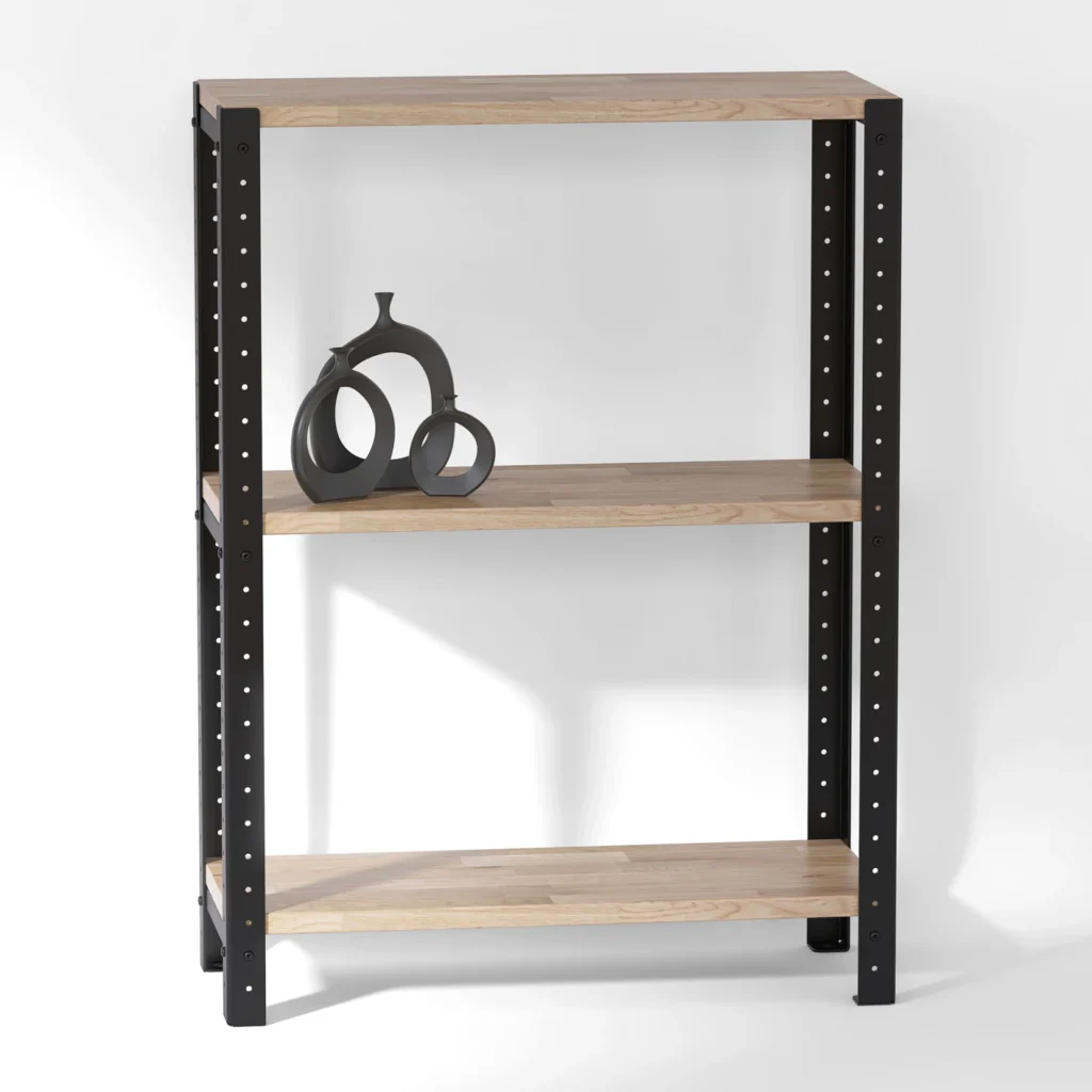 Niski regał loft 60x25x82 cm z dębowymi półkami pasuje do różnych aranżacji, nie tylko tych w stylu loft. Minimalistyczna konstrukcja łącząca w sobie stal i drewno sprawdzi się w wielu miejscach. Regał może pełnić funkcję stolika nocnego, podręcznej szafki czy nawet stylowego kwietnika. Po odpowiednim zabezpieczeniu można używać go także na dworze, np. na tarasie czy balkonie.