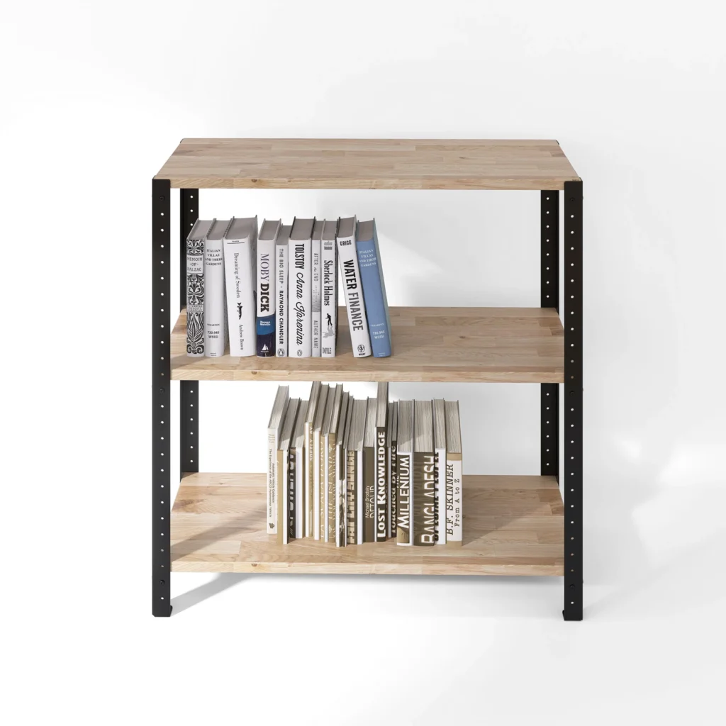 Szeroki regał loft 80x35x82 cm z dębowymi półkami sprawdzi się zarówno w biurze, lokalach usługowych, jak i pomieszczeniach prywatnych. Wykorzystany w domu może pełnić funkcję niskiego regału kuchennego na ozdobne naczynia czy potrzebne sprzęty, dekoracyjnej szafki na ręczniki i akcesoria łazienkowe czy szafki do przedpokoju. Jeśli posiadasz balkon lub taras, możesz wykorzystać regał także jako półkę na kwiaty.