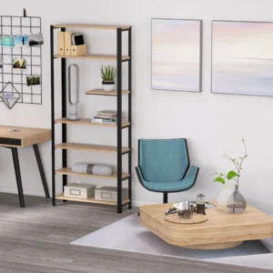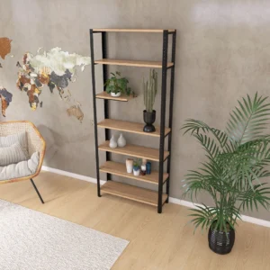 Stylowy regał LOFT z solidną stalową konstrukcją i półkami z płyty meblowej w dekorze dąb to połączenie nowoczesnego designu z funkcjonalnością. Dzięki przemyślanej budowie z jedną węższą półką, świetnie sprawdzi się jako regał na kwiaty doniczkowe, wazony, obrazy i ozdoby. To idealny wybór do salonu, biura czy przedpokoju.