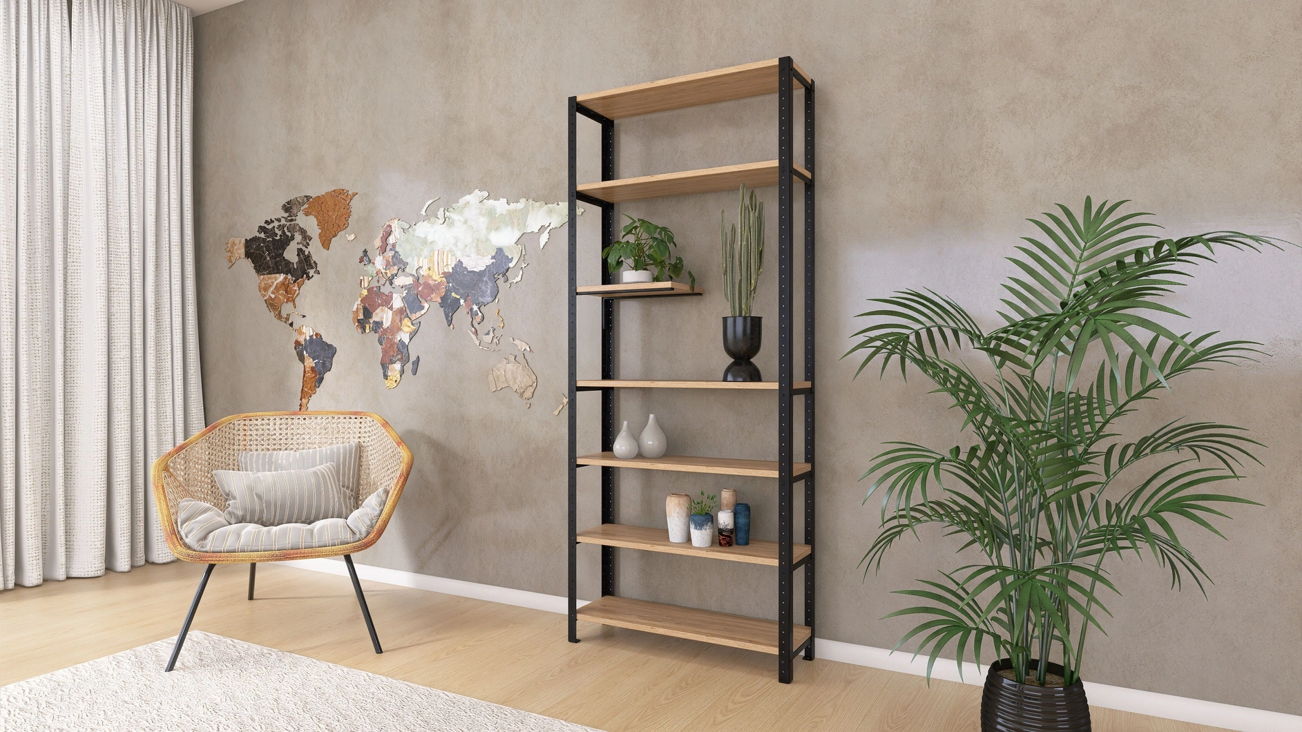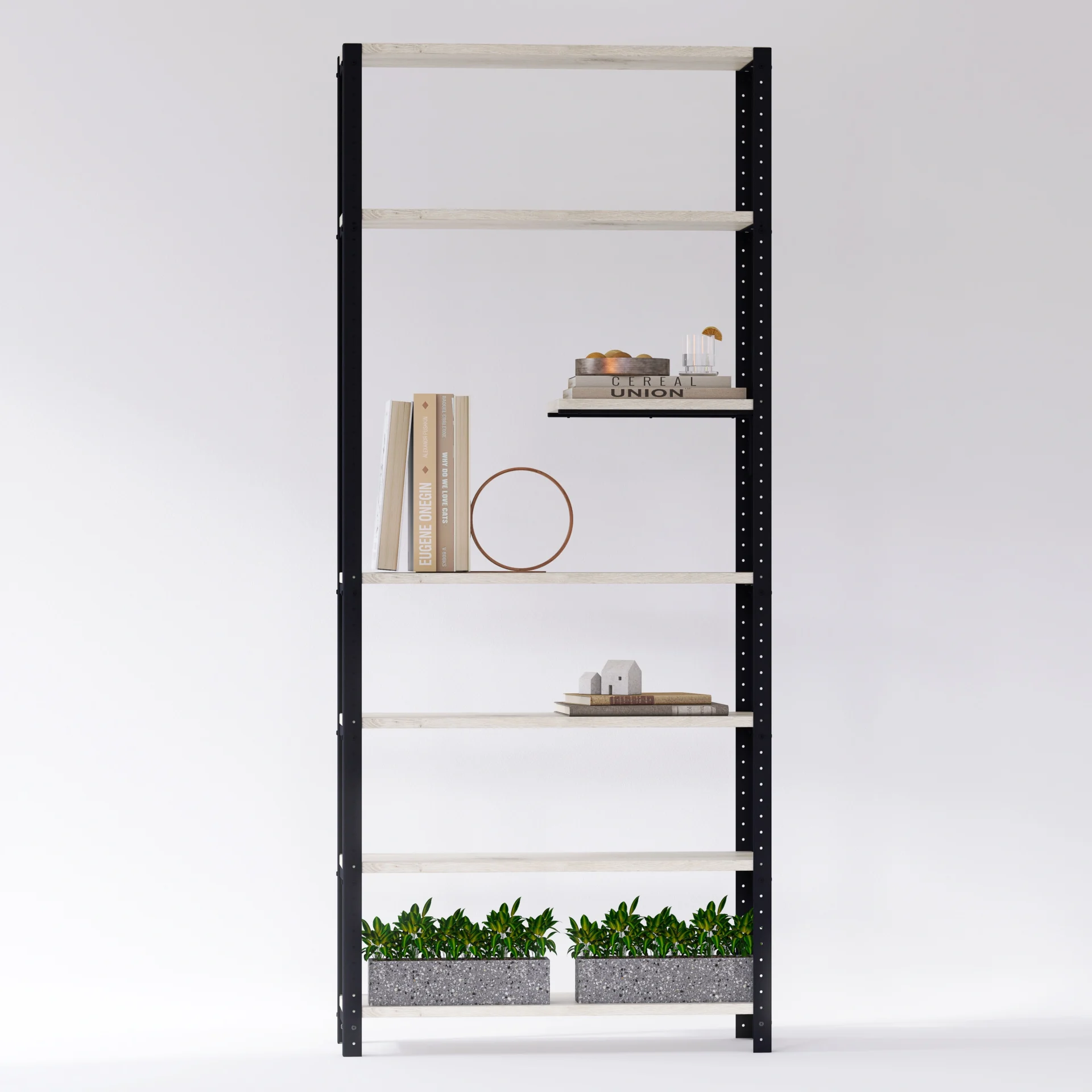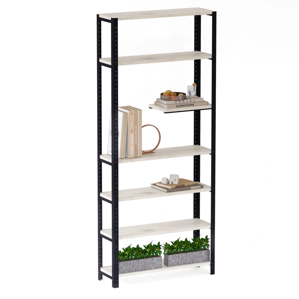 Regał został zaprojektowany jako mebel modułowy, co oznacza możliwość rozbudowy oraz swobodnej konfiguracji. Możesz dodawać kolejne półki, rozszerzać o dodatkowe segmenty lub zmieniać ich rozstaw. Dzięki temu regał dopasuje się do zmieniających się potrzeb – idealnie sprawdzi się zarówno jako regał na rośliny, jak i domowa biblioteczka lub przestrzeń do ekspozycji dekoracji.