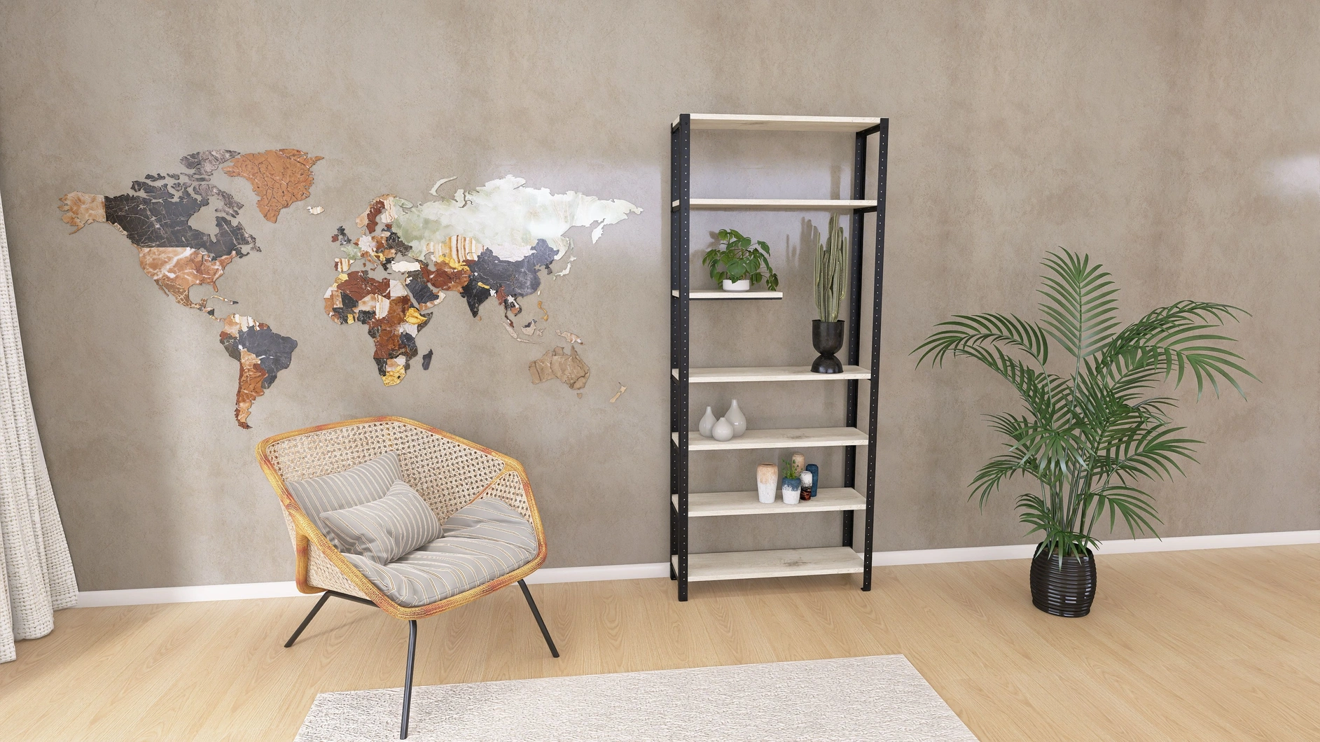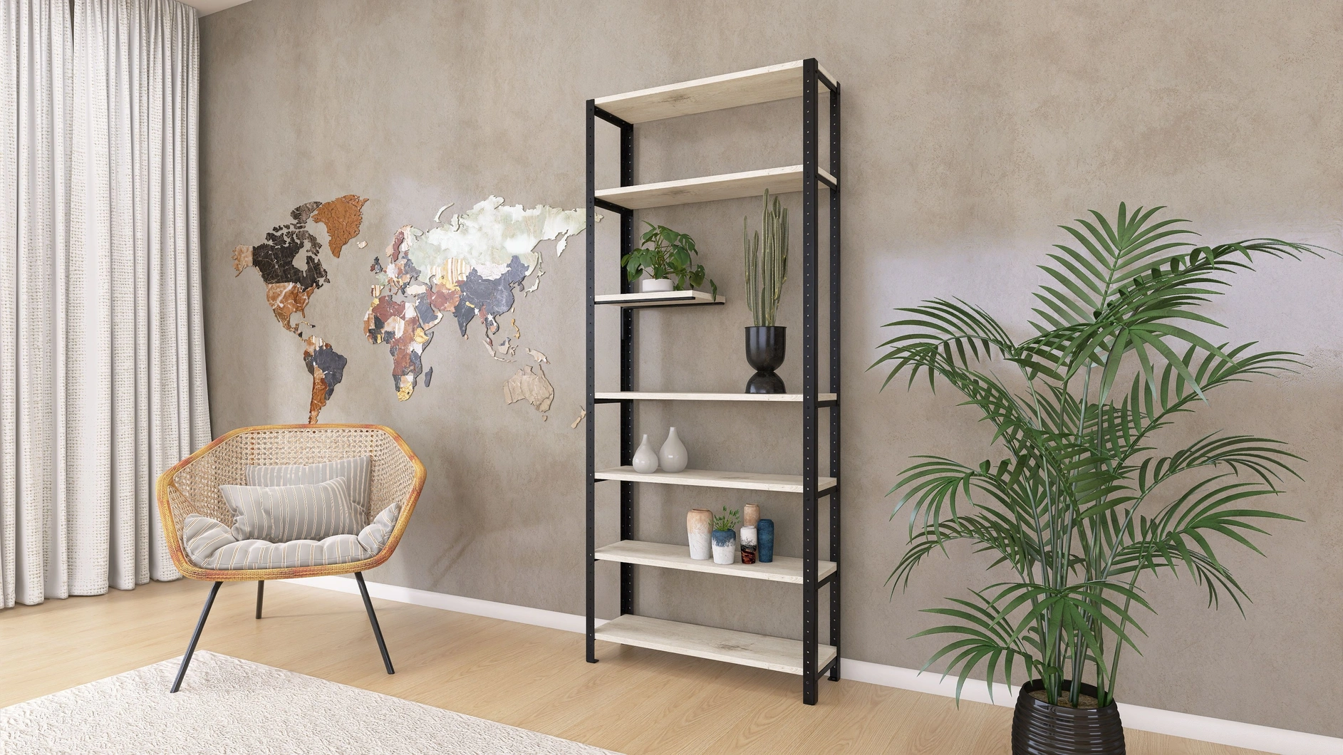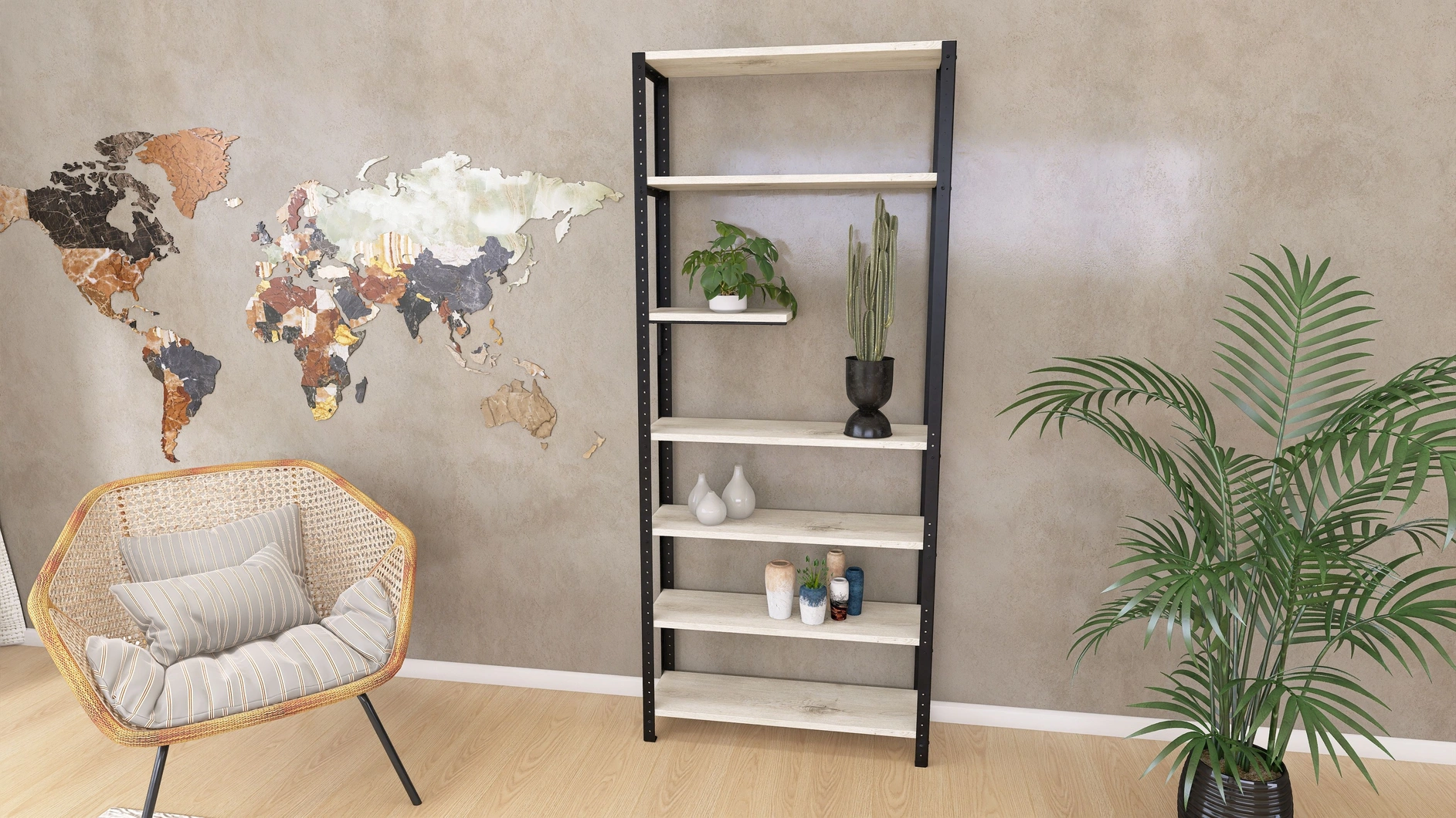 Regał został zaprojektowany jako mebel modułowy, co oznacza możliwość rozbudowy oraz swobodnej konfiguracji. Możesz dodawać kolejne półki, rozszerzać o dodatkowe segmenty lub zmieniać ich rozstaw. Dzięki temu regał dopasuje się do zmieniających się potrzeb – idealnie sprawdzi się zarówno jako regał na rośliny, jak i domowa biblioteczka lub przestrzeń do ekspozycji dekoracji.